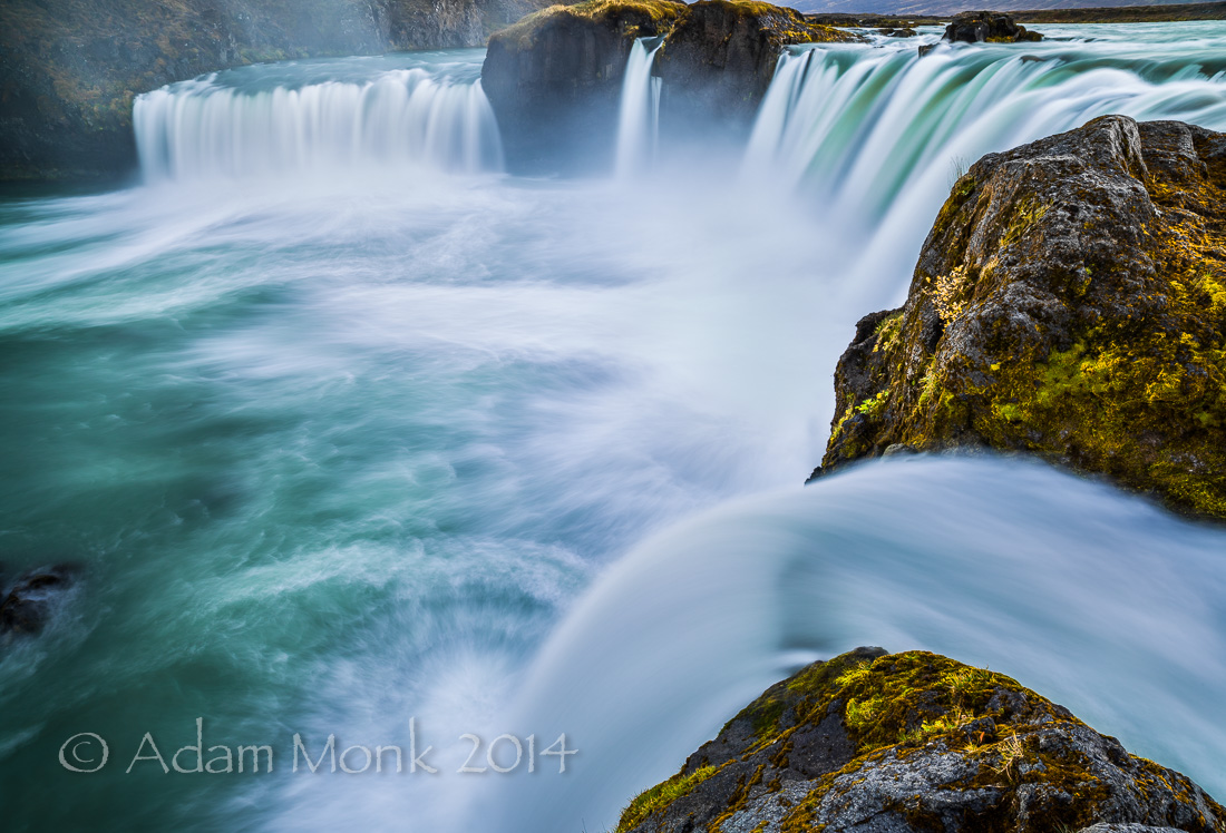 To shoot images of Godafoss waterfall you can choose from both sides of the falls, and many different High and low perspectives. This is the low down perspective shot right on the water level. There was water spray everywhere, so it was wipe and shoot again.