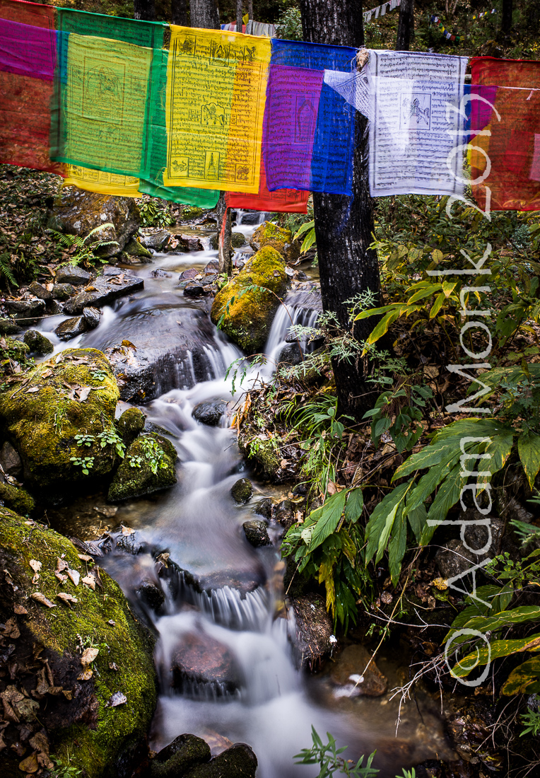 The rivers in Bhutan all run straight out of the mountains, usually from snow melt, so they are all rapids and waterfalls, blue and very cold! The coloured Prayer Flags add a lovely cultural dimension and really place the image firmly in the Buddhist Himalayas. The Bhutanese, who are almost exclusively Buddhist (Buddhism is part of their constitution) place the prayer flags in many natural beauty spots, particularly high passes and across river valleys.